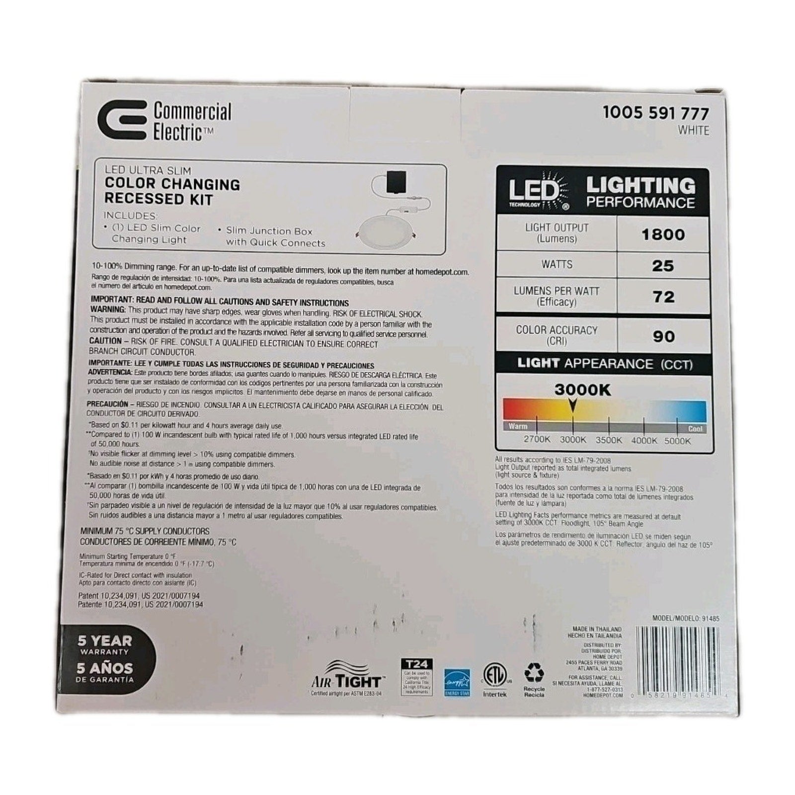 The Commercial Electric 8in Round Ultra Slim LED Integrated Recessed Lighting 91485 is a sleek and modern lighting fixture designed for home and commercial spaces. With an 8-inch diameter and a round shade shape, this white-colored LED light provides a bright and energy-efficient illumination. The corded power source and integrated LED technology ensure a long-lasting and high-quality lighting experience. Ideal for adding a stylish and contemporary touch to any room, this recessed lighting fixture from Commercial Electric is a versatile and practical lighting solution.