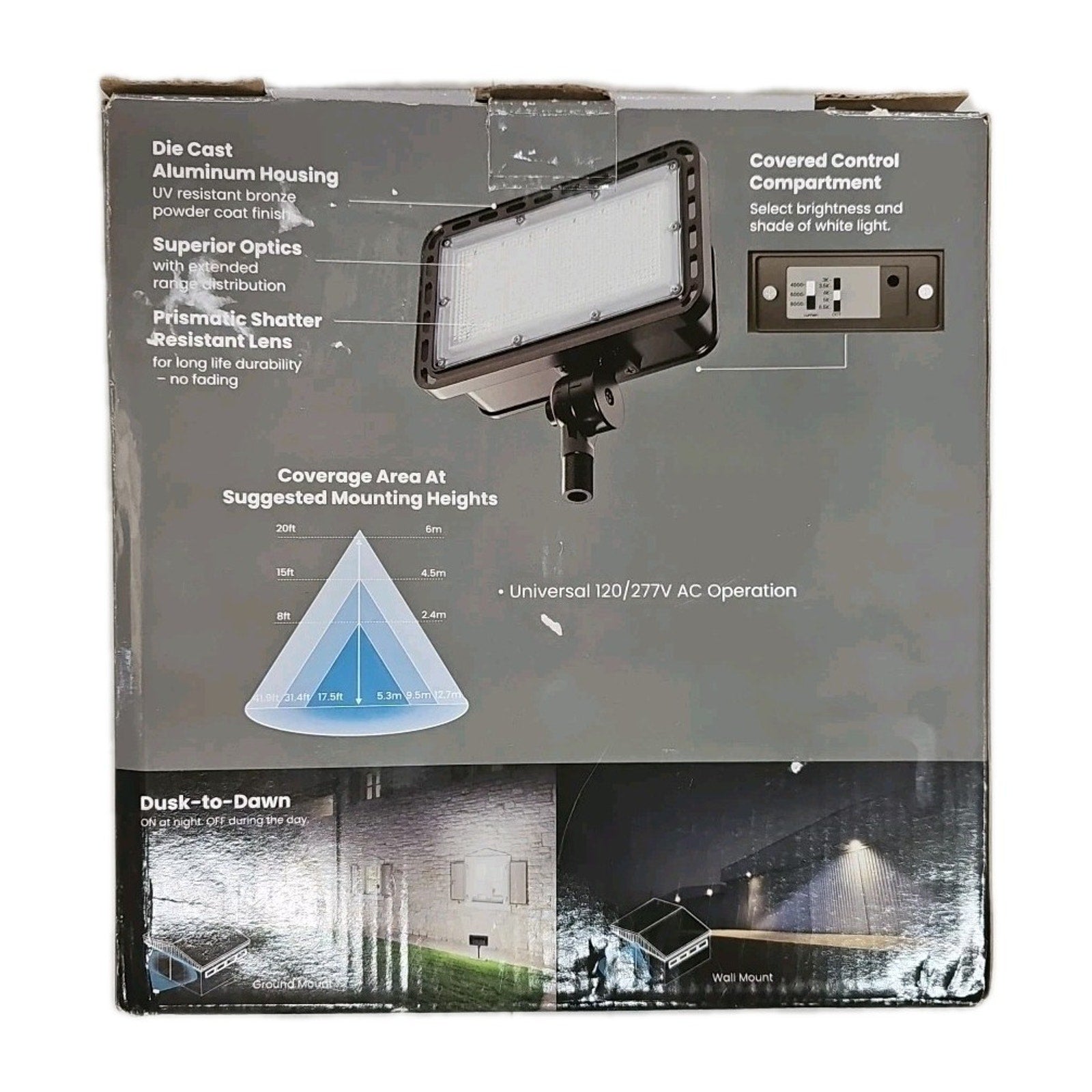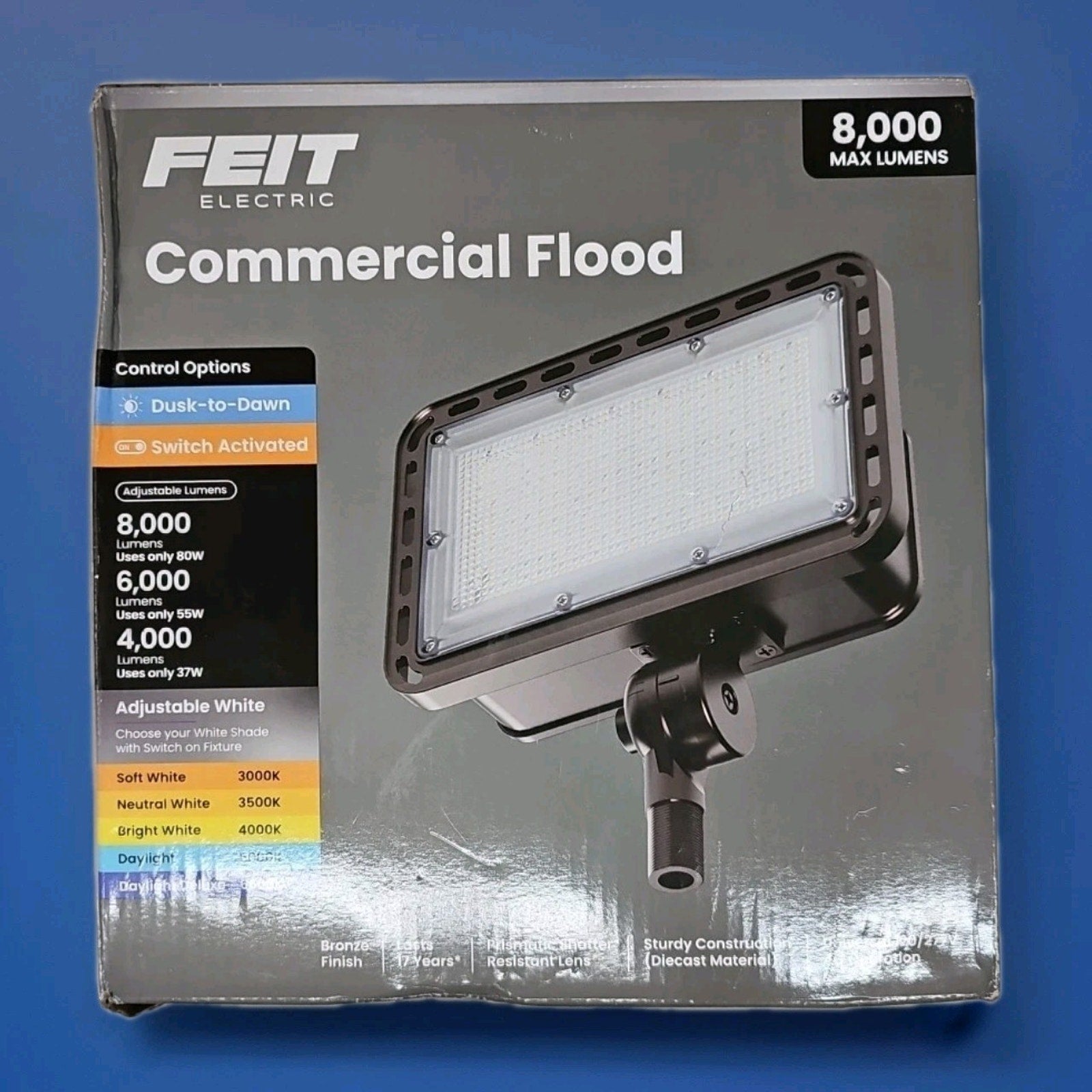 The Feit Electric Select LED Selectable 5CCT Bronze Dusk to Dawn Wall Flood Light is a stylish and modern outdoor lighting solution perfect for adding enhanced security and visibility to your yard or garden. With a power source of hardwired electricity, this flood light boasts a maximum output of 8000 lumens with adjustable white color temperatures ranging from 3000-6500K. The durable aluminum construction and polycarbonate lens ensure resistance to rust, water, and weather, making it a reliable choice for long-lasting illumination. Additionally, the 90-degree light beam angle provides a wide and even distribution of light, making it an ideal choice for outdoor spaces.